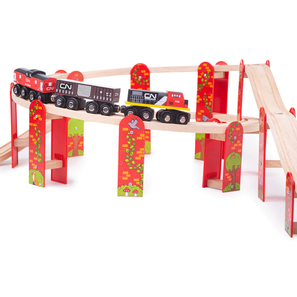 Das Eisenbahngebäude ist dank der präzisen Abmessungen der Kunststoffstützen und der dichten Einsätze in den eingebauten Gleisen stabil. Dank der festen Verbindungen lässt sich das Bauwerk einfach verschieben, ohne dass es auseinanderfällt. Der Packungsinhalt ist eine Hängegleisbahn ohne Züge.Haupteigenschaften: Die Eisenbahnen und ihr Zubehör der Marke Bigjigs Rail können mit allen anderen Holzeisenbahnen auf dem Markt kombiniert werdenHergestellt aus hochwertigen und verantwortungsvoll gewonnenen natürlichen MaterialienEntspricht den aktuellen europäischen SicherheitsstandardsFördert Fantasie, Geschicklichkeit und Koordination. Im Lieferumfang ist eine Hängeanlage ohne Züge enthalten
