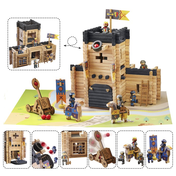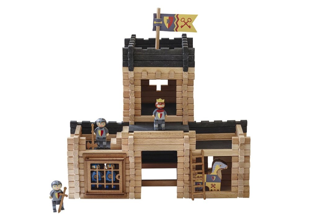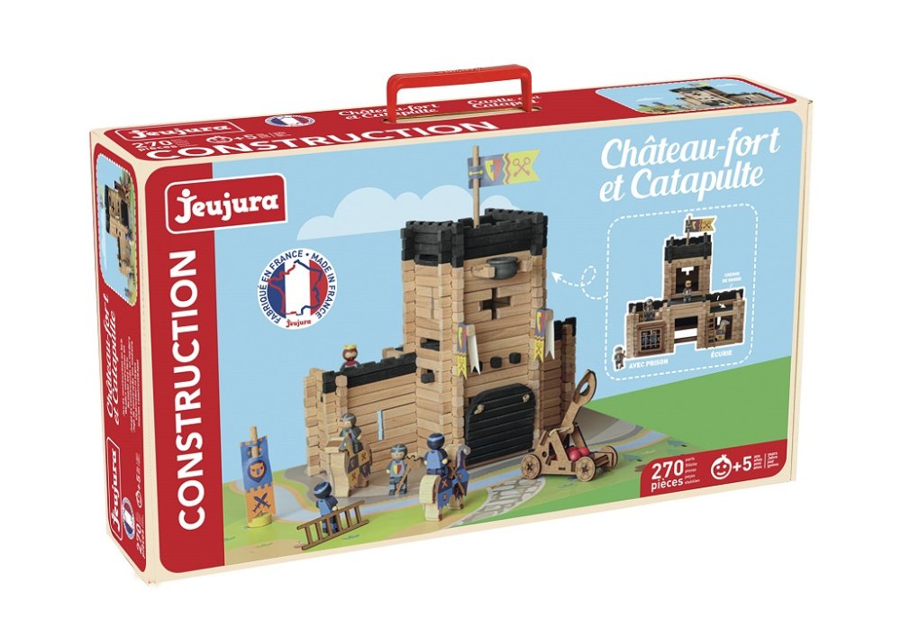 Erleben Sie große Abenteuer mit diesen tapferen Rittern! Bauen Sie Ihre eigene Burg, installieren Sie eine Zugbrücke, ein Gefängnis, einen Wachweg, Flaggen und bauen Sie ein Katapult. Es reicht, aufs Pferd zu steigen und die Eroberung kann beginnen! Die Baukästen von Jeujura Constructions haben eine lange Tradition und gehören zu den klassischen französischen Spielzeugen. Bietet thematisch gestaltete Serien an: Chalets, Häusern und Bauernhöfen, aber auch dem Wilden Westen und dem Mittelalter. Sie lassen sich frei miteinander kombinieren, und für viele von ihnen werden auch Zubehör, Figuren und Fahrzeuge angeboten. Sie werden in Frankreich aus massivem Buchen- und Kiefernholz französischer Herkunft hergestellt. Die Teile werden ausschließlich mit Farben und Lacken auf Wasserbasis behandelt. Jedes Set ist in einem praktischen Kartonkoffer verpackt, der mit Pflanzenfarben bedruckt ist, und eine leicht verständliche Anleitung ist im Lieferumfang enthalten. Haupteigenschaften: 270 Teile aus Massivholz und eine Unterlagepraktische VerpackungHergestellt in Frankreich