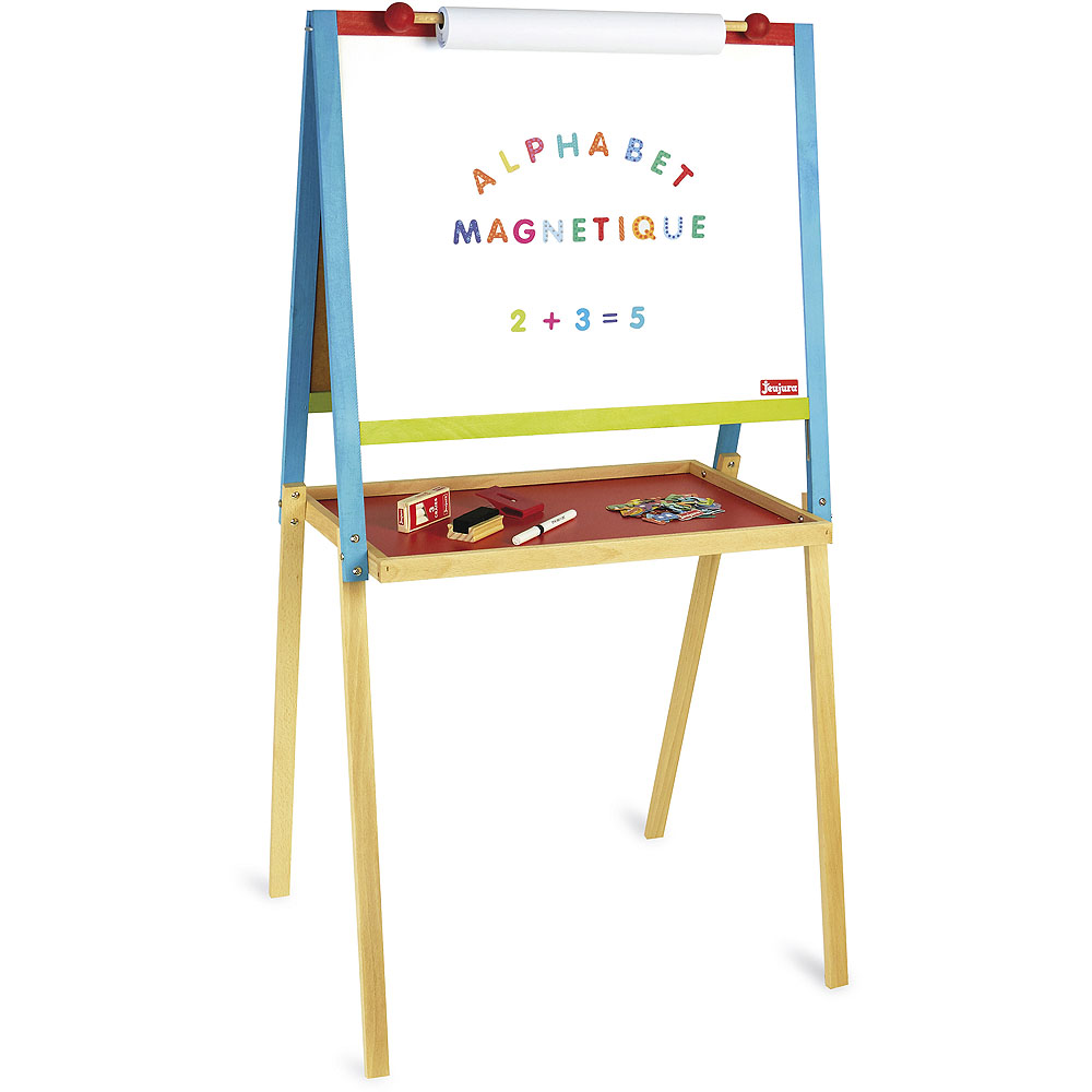 Ein Paar Tafeln auf einer gespreizten Holzkonstruktion, ausgestattet mit einem großen Ablage- oder Stauraum. Auf die schwarze Tafel wird mit Kreide geschrieben und gezeichnet, die weiße Tafel kann mit speziell dafür vorgesehenen Stiften beschrieben und mit einem Filzschwamm abgewischt werden. Zur Ausstattung gehört auch ein Halter für Papierrollen, die separat als Zubehör geliefert werden. Hergestellt in Frankreich aus massivem Buchen- und Kiefernholz französischer Herkunft. Die Teile werden ausschließlich mit Farben und Lacken auf Wasserbasis behandelt. Verpackt in einem Karton, der mit Pflanzenfarben bedruckt ist. Im Lieferumfang enthalten sind Kreiden, ein Stift, ein Schwamm, ein Satz gemusterter Magnetbuchstaben, ein Stift und eine Papierrolle. Haupteigenschaften:Tafel, 3 Kreiden, Stift, Schwamm, Satz Magnetbuchstaben, Stift und PapierrolleAbmessungen der Tafel 56×43 cmfür Kreiden/magnetisch für StifteHalter für Papierrollengroßer StauraumHergestellt in Frankreich