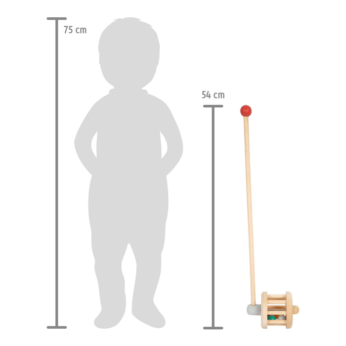 Dieses hölzerne Schiebetier dient auch als Rassel und ist ein sicherer und widerstandsfähiger Begleiter für jedes Kleinkind. Die bunten Kugeln springen wild um die Holztrommel herum, wenn man auf das Schiebetier drückt, und erzeugen ein lustiges Geräusch. Es ermutigt angehende Läufer, sich immer wieder auf Entdeckungsreisen durch die Zimmer zu begeben. Die griffige Holzkugel am Griff ermöglicht es, ein toller Lauflernwagen zu sein. Haupteigenschaften: fördert die körperliche Aktivitätentwickelt das Gleichgewicht auf spielerische Weise