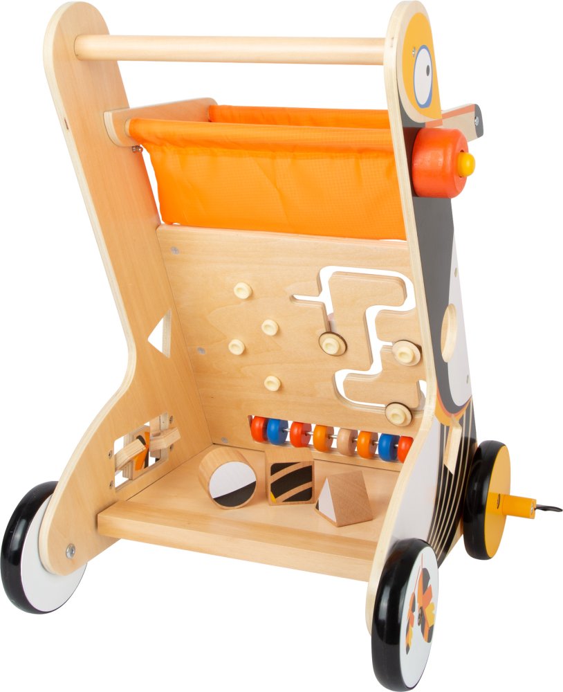 Was für ein schöner Vogel! Der ungewöhnliche Lauflernwagen Tukan bietet Kindern Spiel und Spaß in einem. Der Lauflernwagen bietet verschiedene Aktivitäten auf 3 Seiten, zum Beispiel eine Einsteckplatte, einen Abakus, ein Schiebelabyrinth, Zahnräder… Er unterstützt Kinder beim Laufen und trainiert auch ihre Feinmotorik. „Schnabel“ und Unterseite des Lauflernwagens bieten Stauraum für Holzklötze oder anderes Spielzeug. Der Tukan hat an den Vorderrädern „Füße“, die bei Bewegung ein lustiges Geräusch machen. Die Gummiräder sorgen zudem für einen leisen Lauf auf harten Böden. Der Lauflernwagen ist aus Holz und hat ein schönes Design. Das Textil des Korbs können Sie mit einem feuchten Tuch abwischen oder waschen. Er ist ein praktischer Begleiter für die ersten Schritte, der mit seinem attraktiven und exotischen Design kleine wie große Kinder beeindruckt.. Haupteigenschaften: Besonders stabil, dank robuster Konstruktion und dreieckiger Form Gummierte Räder für leises und sicheres FahrenWeitere Spielmöglichkeiten mit Holzbausteinen, Spielelementen, Hupe, Labyrinth und Zahnrädern Klappernde Füße erzeugen lustige Geräusche beim Fahren Schnabel und Unterteil können auch praktische Stauräume sein Der Aufbewahrungskorb (Schnabel) ist aus pflegeleichtem und reinigungsfreundlichem Stoff gefertigt