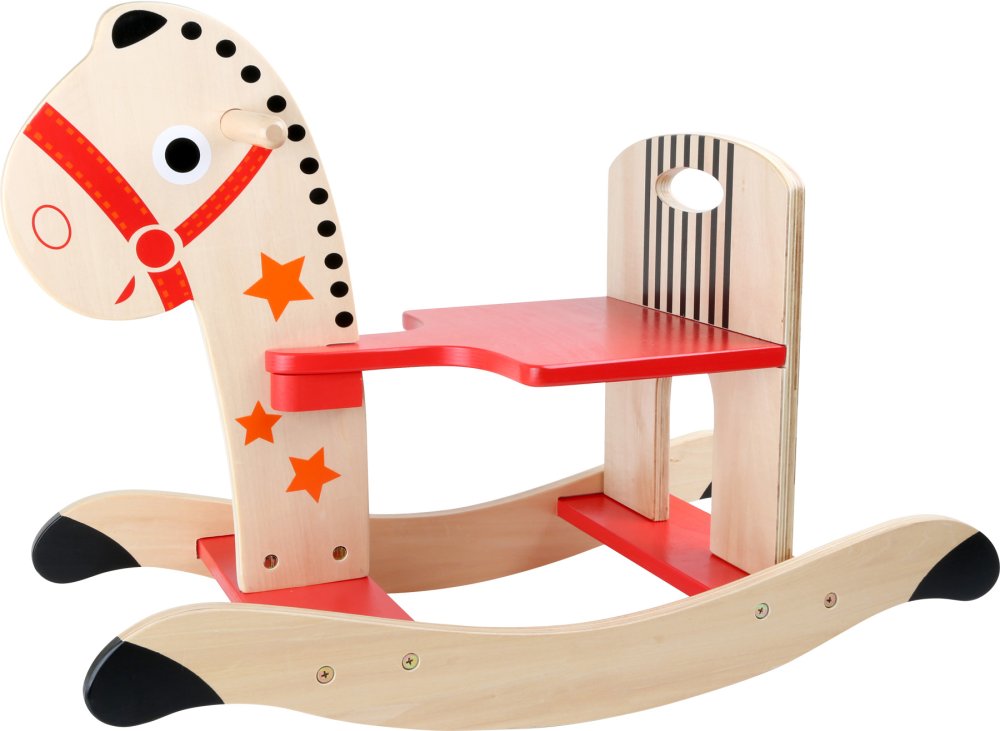 Beim Reiten auf diesem robusten Schaukelpferd aus Holz können Kinder ihre Gedanken in ferne Welten schweifen lassen. Mit diesem breiten Holzsitz und den Fußstützen haben junge Reiter einen festen Halt und können sich beim Galoppieren spielerisch an den beiden Holzgriffen am Kopf des Pferdes festhalten. Das Produkt erfordert eine Montage und wird mit einer bebilderten Montageanleitung geliefert. Haupteigenschaften: robuste HolzausführungSitzhöhe 24 cmfördert die Bewegungsaktivität, das Gleichgewicht und die Koordination