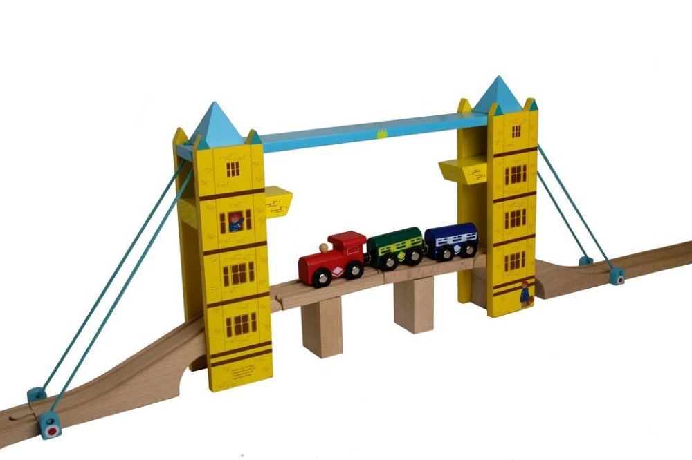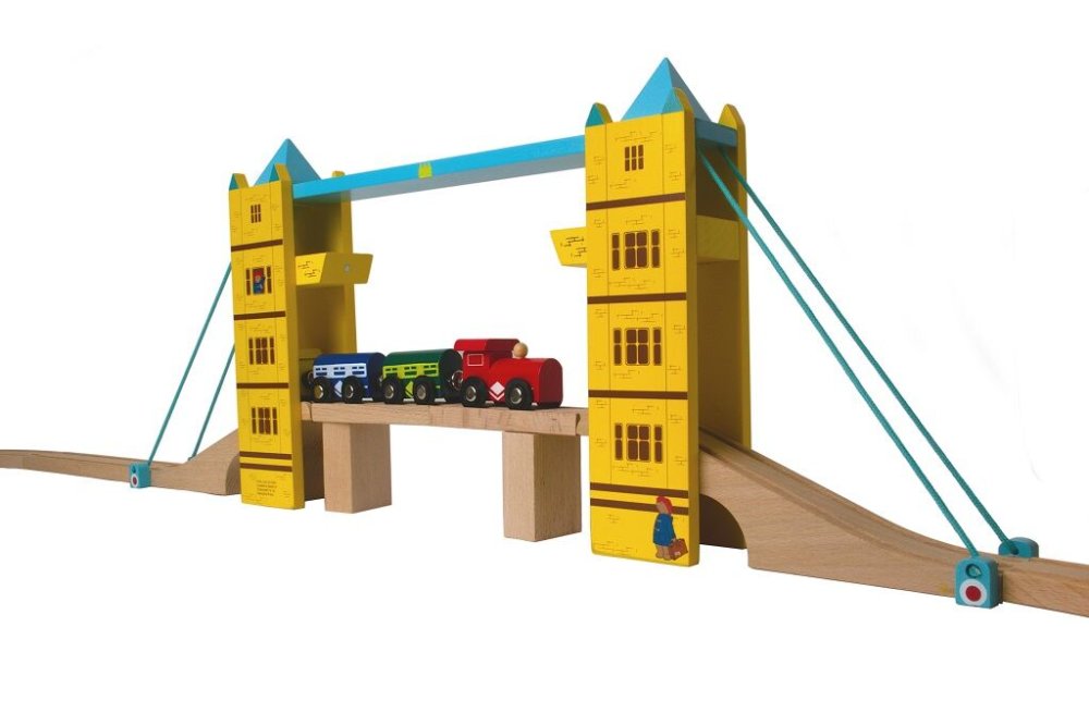 Diese hölzerne Zugbrücke darf in keiner Eisenbahnsammlung fehlen. Inspiriert von der Londoner Tower Bridge begeistert diese Brücke mit ihrer Klappfunktion und den tollen Farben, ergänzt durch die fabelhafte Figur des Paddington Bären. Die angehobenen Schienen werden von eingebauten Magneten gehalten. Hochwertige Ausführung, kompatibel mit anderen Eisenbahnmarken. Der Zug ist nicht im Lieferumfang enthalten. Haupteigenschaften: Hergestellt aus hochwertigen und verantwortungsvoll gewonnenen natürlichen MaterialienEntspricht den aktuellen europäischen Sicherheitsstandardsfördert Fantasie, Geschicklichkeit und Koordination
