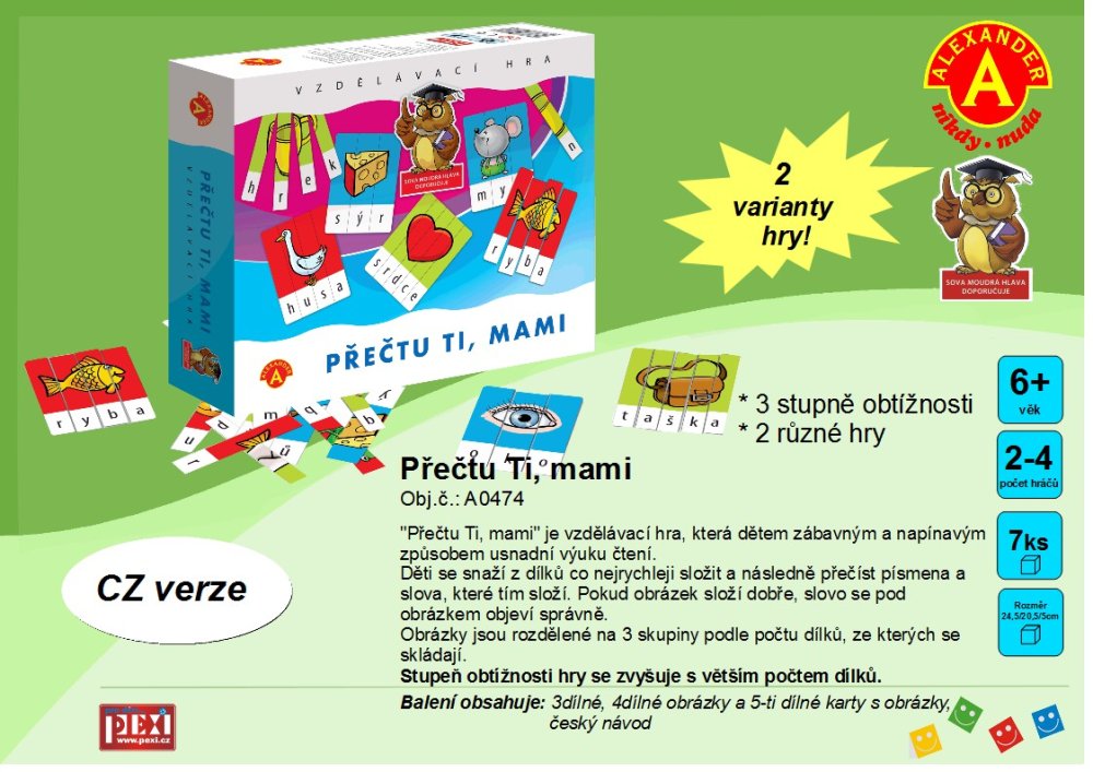 "Ich lese dir vor, Mama" ist ein Lernspiel für Kinder ab 6 Jahren, das das Lesenlernen auf spielerische und originelle Weise erleichtert. Die Kinder versuchen, die Bilder so schnell wie möglich aus bunten Teilen zusammenzusetzen und anschließend die Buchstaben und Wörter zu lesen, die sie dabei zusammensetzen. Die Teile enthalten schöne Bilder, die ihnen das Zusammensetzen von Wörtern erleichtern. Wenn ein Bild gut zusammengesetzt ist, erscheint das Wort korrekt unter dem Bild. Die Bilder sind in 3 Gruppen nach der Anzahl der Teile unterteilt, aus denen sie bestehen. Als Hilfestellung dient beim Spielen eine Liste von Wörtern – Bildern, die sich am Ende der Anleitung befindet.Der Schwierigkeitsgrad des Spiels steigt mit der Anzahl der Teile.Wenn das Niveau der Spieler einem niedrigeren Schwierigkeitsgrad entspricht, kann eine geringere Anzahl von Bildern verteilt werden, z. B. drei (1×3-teilig, 1×4-teilig, 1×5-teilig) oder z. B. nur zwei 3-teilige für die Kleinsten. Die Packung enthält: insgesamt 132 Teile3-teilige Bilder mit Buchstaben (8 Stück)4-teilige Bilder mit Buchstaben (12 Stück)5-teilige Bilder mit Buchstaben (12 Stück)tschechische Spielanleitung 1 Stück Haupteigenschaften: originelle Art des Lesetrainingsdrei Schwierigkeitsstufen des Spielsschnelle Überprüfung der Richtigkeit Dokumentation: Spielanleitung CZ