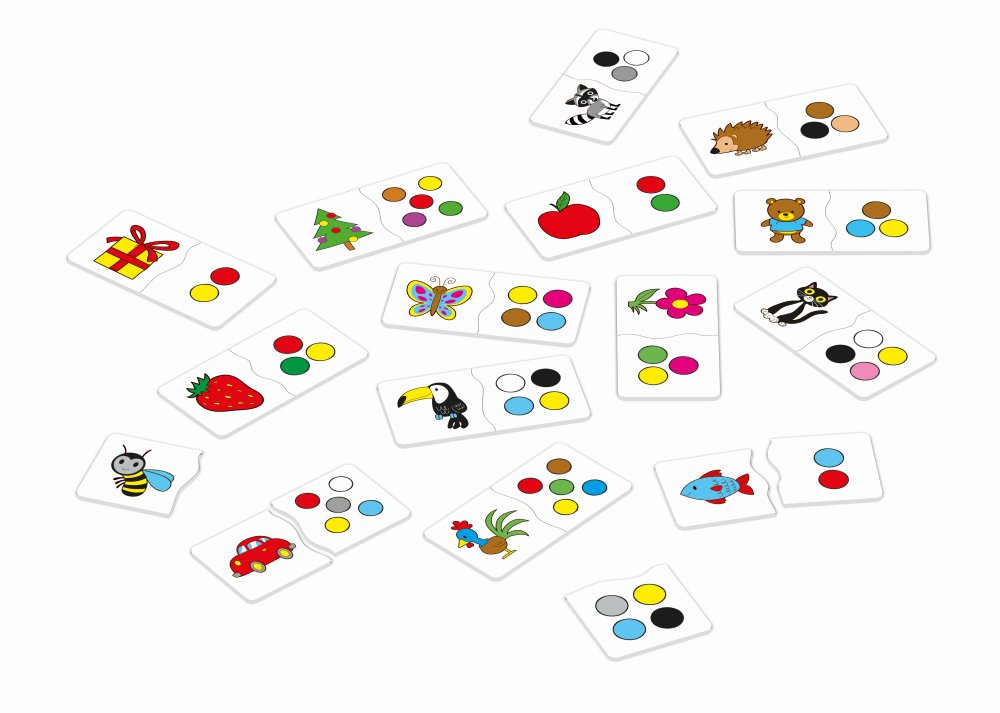 Auszeichnung Spielzeug des Jahres 2018 – 3. Platz. HRA ŠKOLOU® – BARVIČKY ist ein Lernspiel für Kinder ab 3 Jahren, mit dem Kinder auf spielerische Weise lernen, ihre Fähigkeiten zu entwickeln. Sie lernen, Farben zu erkennen und dem richtigen Bild zuzuordnen, verbessern ihre Wahrnehmung und Konzentration. Das Wissen über Farben ist eine der grundlegenden Fähigkeiten von Kindern im Vorschulalter. Dieses Spiel hilft Kindern mit Hilfe von Bildkarten, die einzelnen Grundfarben zu erkennen und zu benennen. Das Spiel BARVIČKY besteht aus 24 verschiedenen Plättchen. Ein Plättchen besteht immer aus zwei Hälften. Eine Hälfte enthält ein Bild und die andere Hälfte verschiedenfarbige Kreise. Die Farbe der Kreise stimmt mit den Farben überein, die das Bild auf dem entsprechenden zweiten Teil enthält. Die Aufgabe der Kinder ist es, 2 Karten zu finden, auf denen die gleichen Farben sowohl auf dem Bild als auch in den Kreisen sind, und sie zusammenzulegen. Die wellenförmige Verbindung der beiden Hälften der Plättchen verrät den Kindern, ob ihre Bemühungen erfolgreich waren. Auf spielerische Weise lernen die Kinder nicht nur Farben, sondern das Spielen fördert auch die Beobachtungsgabe und Logik sowie nicht zuletzt die Feinmotorik der Kinderhände. – lehrt Farben zu erkennen – hilft, die Feinmotorik zu verbessern – entwickelt Beobachtungsgabe und Wahrnehmung Die Packung enthält: 48 feste Kartonplättchen mit Bildern, eine tschechische und slowakische Spielanleitung