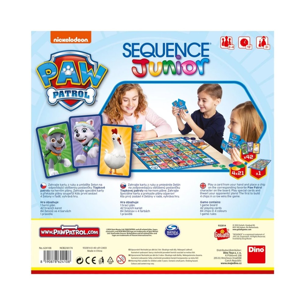 Spielen Sie die Version des beliebten Sequence-Spiels, die für die kleinsten Spieler mit niedlichen Figuren aus der Zeichentrickserie PAW Patrol entwickelt wurde. Nehmen Sie eine Karte aus dem Stapel und platzieren Sie einen Chip auf dem entsprechenden Feld auf dem Spielbrett. Mit speziellen Karten können Sie die Pläne Ihrer Gegner durchkreuzen. Wer als Erster eine Reihe von 4 Chips auf dem Spielbrett bildet, gewinnt. Die Packung enthält: 1 Spielbrett42 Spielkarten 84 Chips in 4 FarbenSpielanleitung Haupteigenschaften: Übt Gedächtnis, Wahrnehmung, Geduld und logisches Denkenfördert Kreativität und Ausdrucksfähigkeitfür 2 bis 4 SpielerSpieldauer ca. 20 Minuten