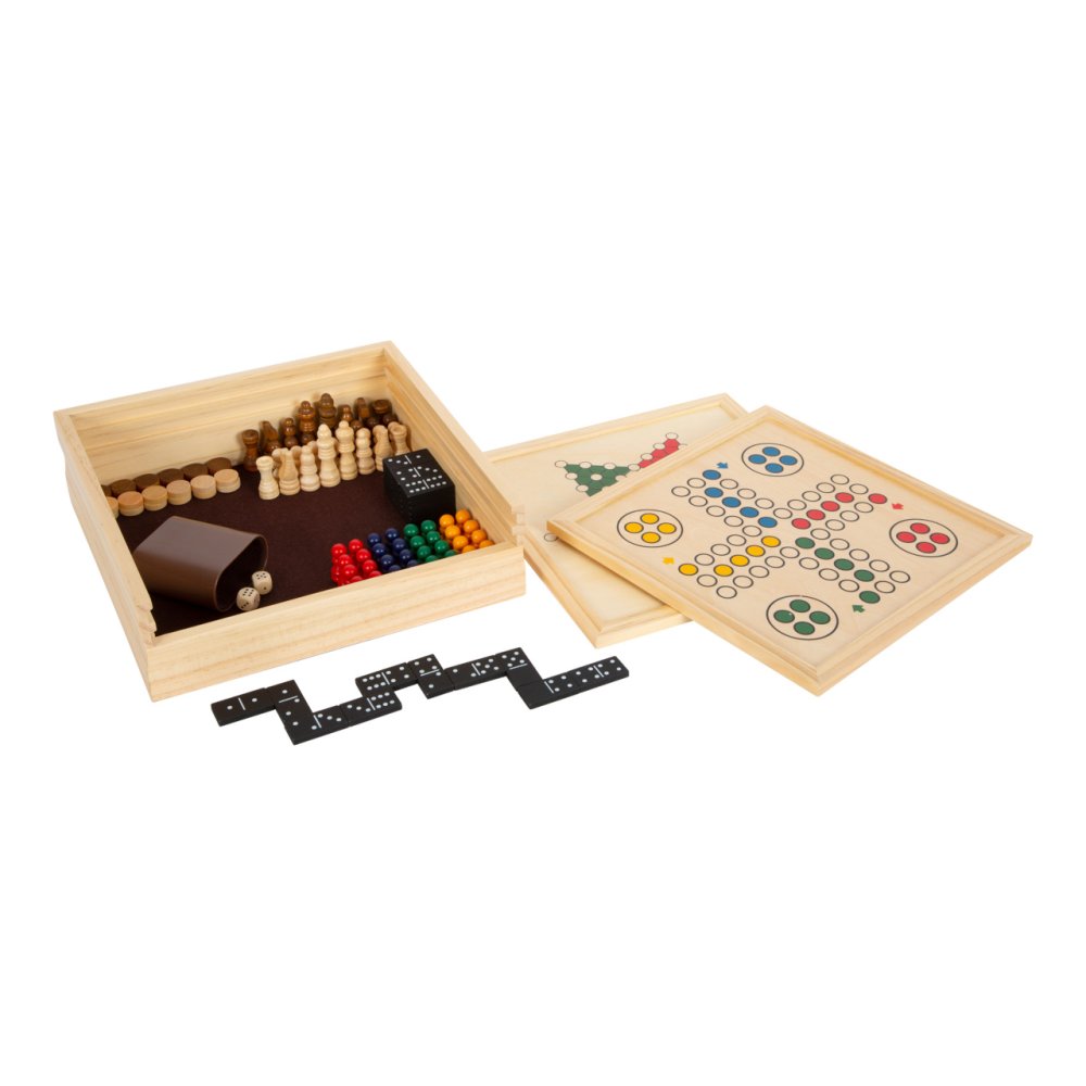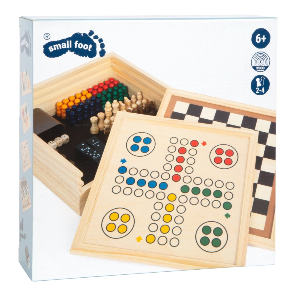 Eine Spielesammlung für die ganze Familie mit allen wichtigen Klassikern und beliebten Gesellschaftsspielen. Ob Domino, Ludo, Schach, Dame, Mühle, Halma & Co.  Diese Spielesammlung mit Spielbrettern aus robustem Holz enthält alles, was Kinder und Eltern für einen unterhaltsamen Spielenachmittag benötigen. In der stabilen Holzbox mit Filzboden geht nichts verloren.  Haupteigenschaften:  langlebiger Spielspaßaalles hat seinen Platz in der Holzkistehochwertige MaterialienAnleitungen zu den Spielen