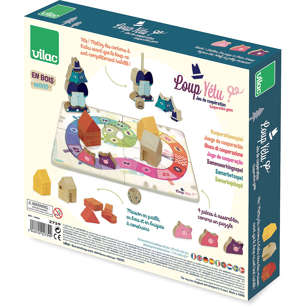 Dieses Spiel ist von einem in Frankreich bekannten Reim aus dem 17. Jahrhundert (Wo bist du, Wolf?) und der Geschichte von 3 kleinen Schweinchen inspiriert. Die Schweinchen spielen gegen den Wolf. Während sich der Wolf anzieht, müssen die Schweinchen eilig zuerst ein Stroh-, dann ein Holz- und schließlich ein Ziegelhaus bauen. Sobald sie das letzte Häuschen fertiggestellt haben (das Dach muss an seinem Platz sein), endet das Spiel: Die Schweinchen sind in Sicherheit und das Spiel ist gewonnen!Seien Sie vorsichtig, wenn der Wolf angezogen ist, bevor die Schweinchen das Ziegelhaus fertiggestellt haben, kann er es wegpusten und das Spiel ist verloren!In der Anleitung kooperative und Solo-Version. Ein Holzspiel, das in Ihrem Zuhause nicht fehlen darf! Spielinhalt: 1 hölzernes Spielbrett (aus 4 Puzzleteilen), 1 hölzerner Wolf (5 stapelbare Teile), 3 Figuren (Schweinchen), 3 Häuschen zum Bauen (jeweils 5 Stück) und 1 Würfel Haupteigenschaften: Spiel nach dem Motiv eines bekannten Märchensenthält 29 Teile Dokumentation: Anleitung zum Spiel Drei Schweinchen (CZ)Anleitung zum Spiel Drei Schweinchen (SK)Anleitung zum Spiel Drei Schweinchen (FR, EN, DE, ES, IT, PT, NL, SE, DA)