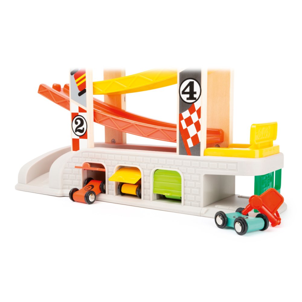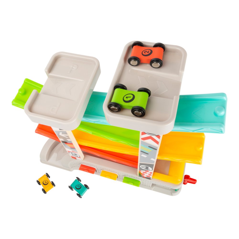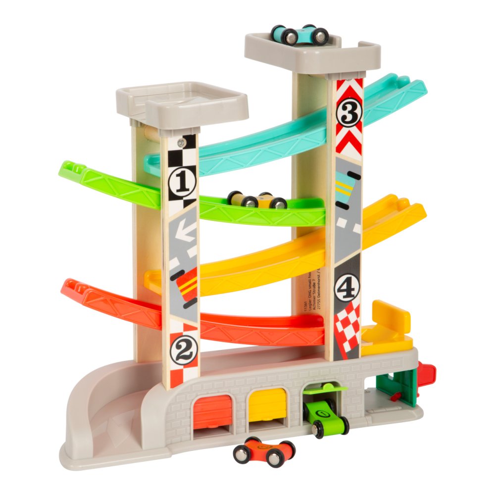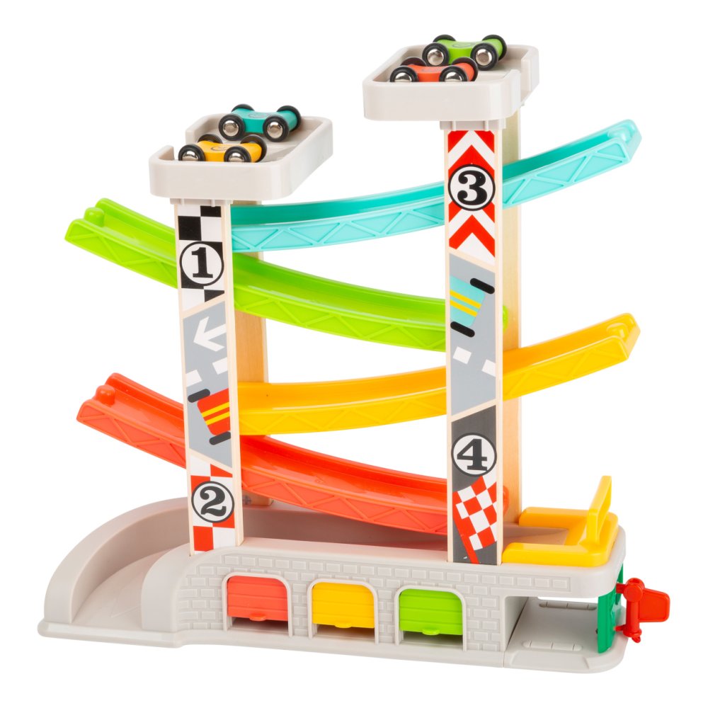Jagen Sie die Autos die Geschwindigkeitskaskade hinunter, ein Rennfahrer kann in engem Abstand den anderen in einer Atmosphäre voller Spannung verfolgen. Die Bahn ist nicht nur mit zwei Startplattformen ausgestattet, sondern auch mit einer Boxengasse, mit der Spiele gespielt werden können, die die Fantasie der Kinder anregen. Am Fuße der Bahn befinden sich Garagen mit zu öffnenden Türen, in denen die Autos zwischen den Rennen ausruhen können und die praktisch zum Aufräumen und Tragen des Spielzeugs genutzt werden können. Die robuste und widerstandsfähige Konstruktion kombiniert Kunststoff- und attraktiv bedruckte Holzteile. Dank seiner einzigartigen Farbgebung zieht die Kaskade leicht die Aufmerksamkeit auf sich und regt die kindliche Neugier an. Haupteigenschaften:Bahn und 4 verschiedenfarbige Autos3 Garagen und eine Tankstelleattraktive und robuste Verarbeitung