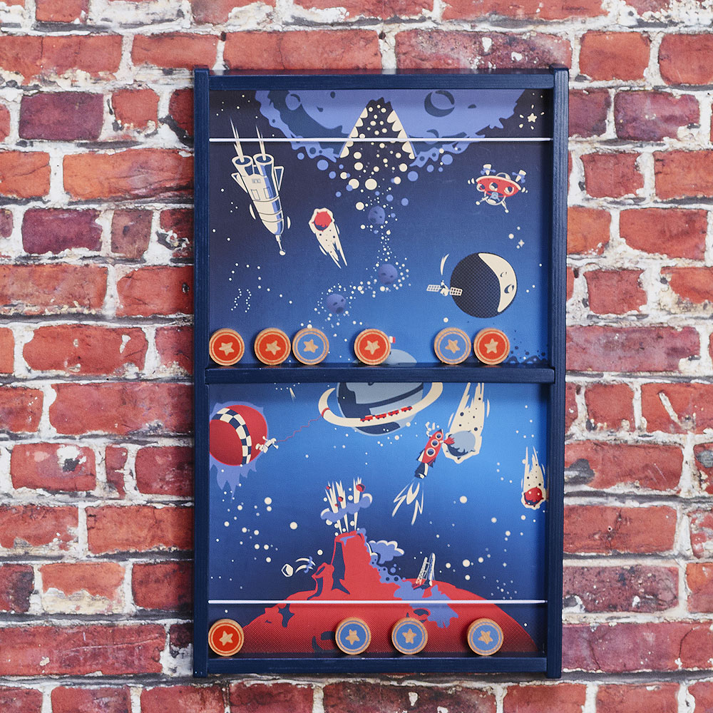3, 2, 1… und los geht's! Reisen Sie mit diesem grandiosen Shuffleboard-Spiel im Retro-Look durch den Weltraum. Ziel ist es, alle eigenen Pucks loszuwerden, bevor der Gegner es auf seiner Spielfeldseite tut, oder alle Pucks vom eigenen Spielfeld zum Gegner zu befördern. Sie müssen das an den Seiten befestigte Gummiband als Abschussvorrichtung verwenden und am geschicktesten sein, um auf das einzige Loch in der Mitte des Spiels zu zielen und den Puck hindurchzubefördern. Für die besten Schützen kann die Mitte durch ein anderes Hindernis mit 2 außermittigen Löchern ersetzt werden! Haupteigenschaften: Das unterhaltsame Beobachtungsspiel entwickelt die motorischen Fähigkeiten von Kindern.Die mittleren Öffnungen sind für ein einfacheres und komplexeres Spiel austauschbaroriginelles Retro-Design