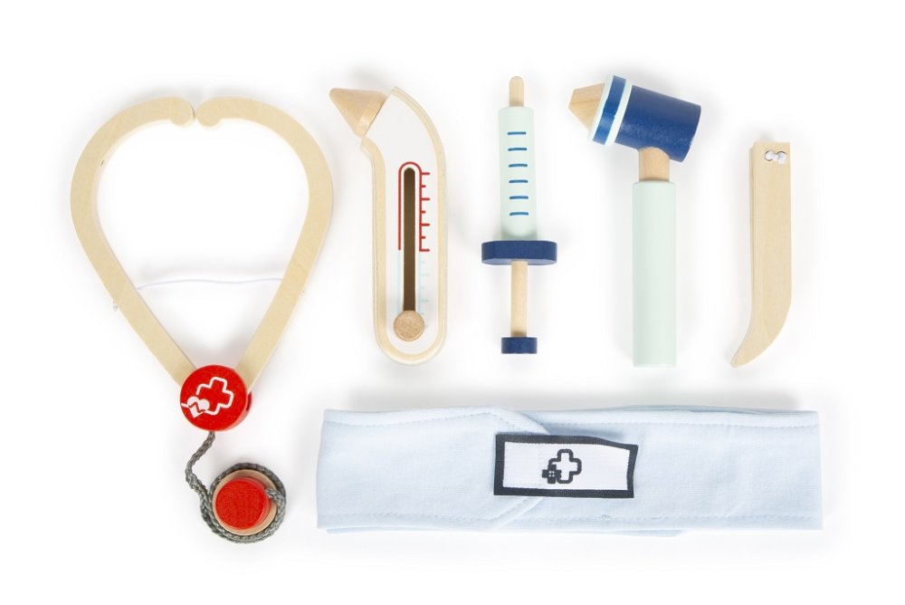 Tauchen Sie ein in die aufregende Welt der echten Medizin! Dieses 6-teilige Set enthält alles, was junge Ärzte brauchen. Mit dem Arztkoffer lassen sich alle kranken Stofftiere und Puppen einfach heilen! Das Set ist aus robustem Holz gefertigt. Injektionsspritze, Thermometer, Otoskop, Pinzette, Verband und Stethoskop dürfen in keinem Haushalt kleiner Ärzte fehlen. Dieses Spielset inspiriert aktiv die Fantasie und Kreativität junger Gesundheitsexperten. Haupteigenschaften: 6-teiliges SetSpritze mit beweglichem Kolben, Otoskop mit echter Lupe, Thermometer mit verstellbarer Temperaturanzeige, Verband mit KlettverschlüssenRobuste und langlebige Ausführung aus massivem Holz
