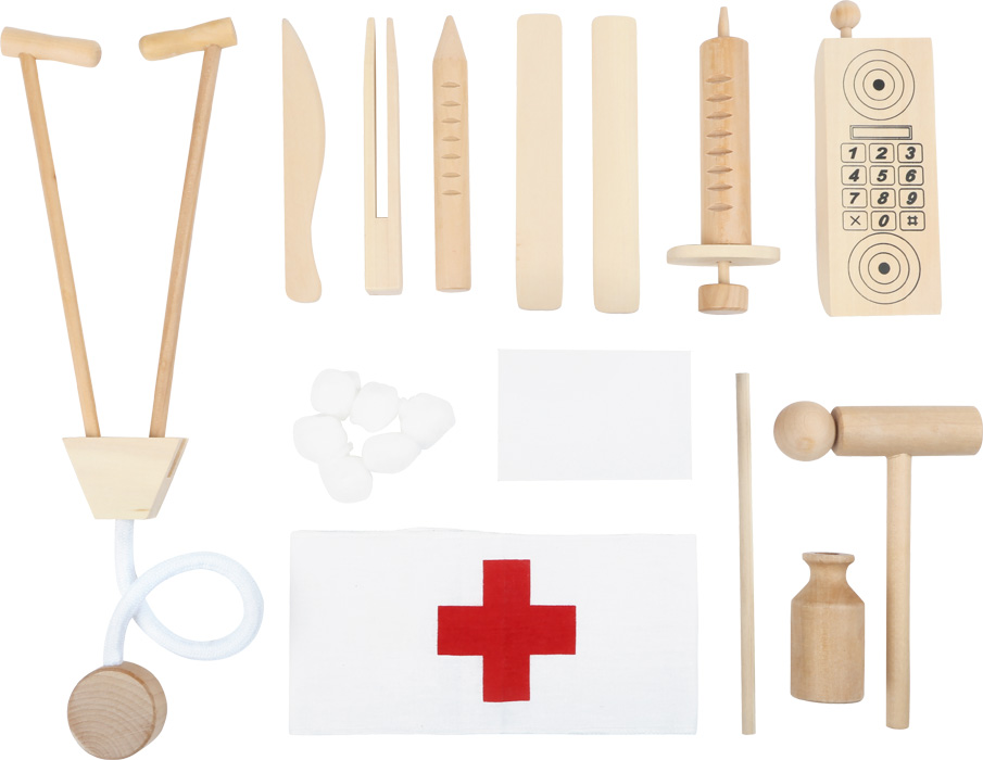 Hochwertiger Holzkoffer mit reichhaltigem Inhalt. Dieser Koffer enthält alles, was ein Arzt braucht: verschiedene Instrumente, ein Notfalltelefon und sogar Injektionsspritzen. Haupteigenschaften: Arztkoffer mit viel medizinischer Ausrüstung aus HolzFlexible elastische Bänder und separate Fächer halten Medikamente und medizinische Geräte an Ort und Stelleklassische DoktorsymboleFördert aktives Spielen und entwickelt soziale Kompetenzen