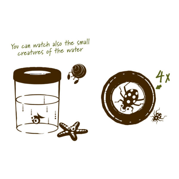 Großer Becher mit Lupe zur Insektenbeobachtung für kleine Entdecker ab 4 Jahren. Es ist aus umweltfreundlichem ABS-Kunststoff gefertigt. Im Lieferumfang des Bechers ist auch eine Pinzette enthalten. Der Becher ermöglicht die Beobachtung lebender Insekten dank der Belüftungsöffnungen. Vergessen Sie nicht, die Insekten nach der Untersuchung wieder in die Natur freizulassen. Es kann auch zur Beobachtung von Blumen, Blättern, Münzen und anderen kleinen Gegenständen verwendet werden. Die Verpackung ist aus recyceltem Karton hergestellt und mit Tinte auf Wasserbasis bedruckt.