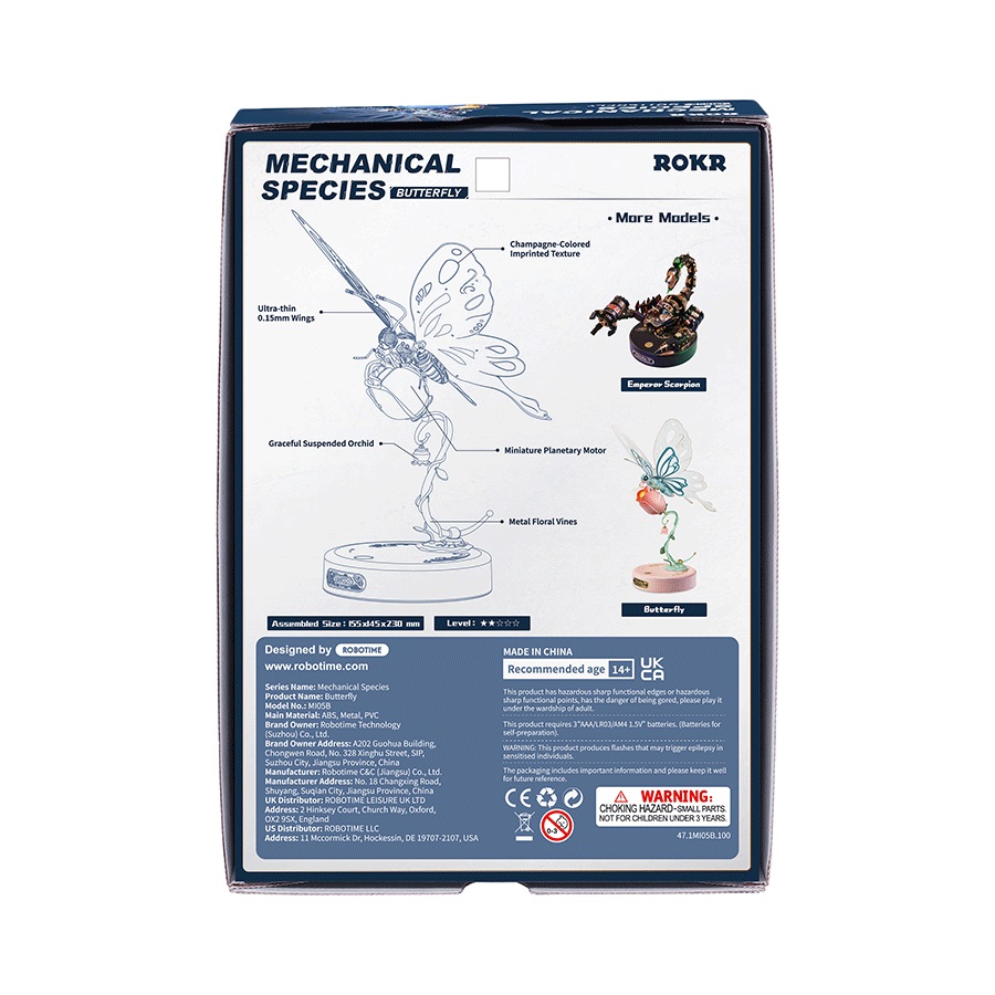 Die Natur ist voller Geheimnisse und Schönheit. Der detailliert gearbeitete mechanische Schmetterling ist so konzipiert, dass er vor Ihren Augen zum Leben erwacht. Der Körper des Schmetterlings besteht aus robustem ABS-Kunststoff und seine weichen, schimmernden Flügel aus dünnem, flexiblem PVC (0,15 mm). Durch ein spezielles Druckverfahren wurden effektvolle, feine Muster in Champagnerfarbe auf den Flügeln erzeugt, und die Rückseite des Körpers ziert ein glitzernder Edelstein, der im Sonnenlicht erstrahlt. Der Schmetterling sitzt auf einer Rosenknospe, die mit einem gewundenen Metallstiel mit einem festen und stabilen Sockel verbunden ist. Am Stiel hängt eine Orchideenblüte. Wenn Sie den Schmetterling einschalten, beginnt er, mit seinen bionischen Flügeln zu schlagen, die Rose leuchtet golden und die Fühler blinken, als würden sie im Sonnenlicht schimmern. Der Schmetterling wird von einem Miniatur-Planetengetriebe-Motor angetrieben (Geschwindigkeit 9000 U/min, Übersetzungsverhältnis 1 : 171, Drehmoment 333 g/cm). Laden Sie Ihre Familie oder Freunde ein und genießen Sie das unterhaltsame Basteln. Das Ergebnis wird sich lohnen! Lieferung mit detaillierter Montageanleitung. Haupteigenschaften:  79 Teilemittlerer Schwierigkeitsgradentwickelt logische und motorische Fähigkeitenfördert die Geduld der Kinderideal als Geschenk oder einzigartige Dekorationdetaillierte Montageanleitung im Lieferumfang enthaltenMiniatur-Planetengetriebe-Motorbenötigt 3 Batterien AAA/LR03/AM4 1,5V – nicht im Lieferumfang enthalten